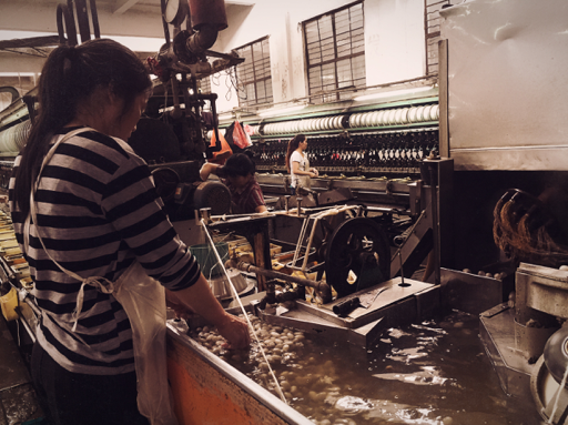 繅絲流程:女工清理蠶繭以便下一個流程機器容易找到絲頭,把單絲擰成絲線。背景是自動繅絲機,約三十年前購買的設備。