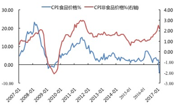 中國歷次通貨膨脹走高,在數據上都體現為食品價格帶動。例如,上圖顯示,2009年年初食品價格同比增速從0%附近起步,到2011年年中升高到15%左右,帶動CPI增速升至6.45%高位。而這一次,CPI從2016年下半年低位爬升,到2017年升至2.55%,食品價格升幅卻反向波動,更在2017年2月跌入負增長(-4.3%),創出1989年以來的新低。
